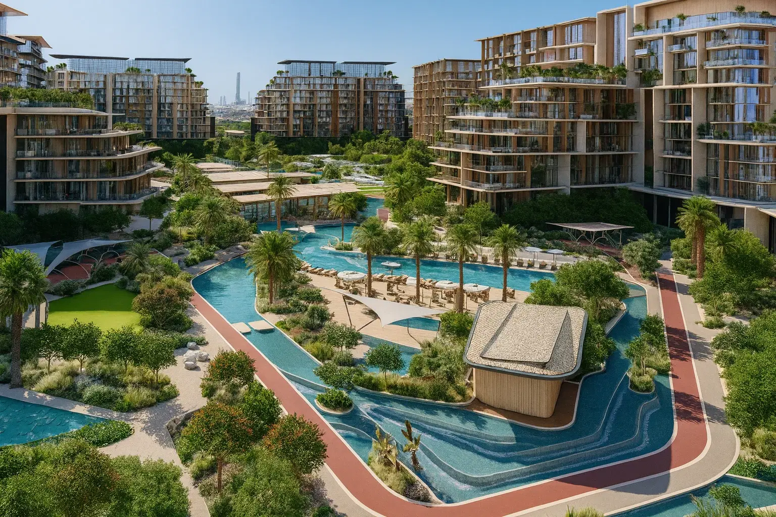 Landscaped jogging routes, bike lanes, sports courts, resort-style pools, sun terraces, and a network of carefully planned kid-friendly play areas are among the amenities that provide an all-encompassing outdoor health experience.